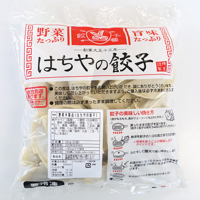 当社の2代目は、戦前満洲に赴いておりました。そのとき満州で食べた「餃子」の味が忘れられず、昭和36年より餃子の製造を始めました。3代目がフライパンをもって市場での試食販売に出かけ、少しずつ広めて行きました。今はすっかりメジャーな食べものとなっている餃子ですが、当時はまったく知られていない食べものです。港町塩竈ならではのエピソードですが、「餃子(ギョウザ)」と読めず、「鮫子(サメコ)」と言っていた人もいたそうです。野菜が中心の餃子の味は今でも「はちやの餃子」の味のベースになっており、パッケージデザインも、市場で販売していた当時のものを踏襲しております。いまでも、パッケージを見て、「懐かしいね。私はこの餃子で育ったんだよ。」というお客様も多くいらっしゃいます。