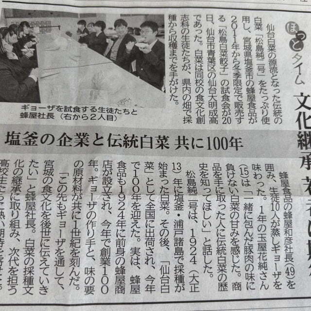 明成高校とふるさとの食文化を学び伝える取り組みから14年目、創業者の生家(大郷町羽生)で育てられた仙台白菜の伝統品種「松島純2号」を使用した餃子。松島湾の牡蠣エキスを具材に加え、無添加製法で優しい味わいに仕上げています。